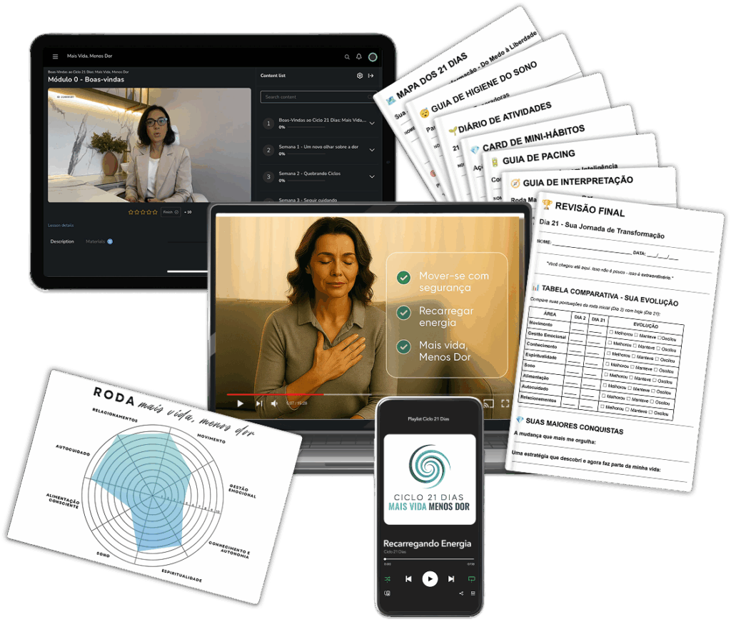 Em 21 dias você vai percorrer um Caminho Guiado com estratégias para te ajudar a sair do ciclo que mantém sua dor, se mexer com mais segurança e voltar a se sentir capaz de viver mais no seu ritmo e sem pressão.